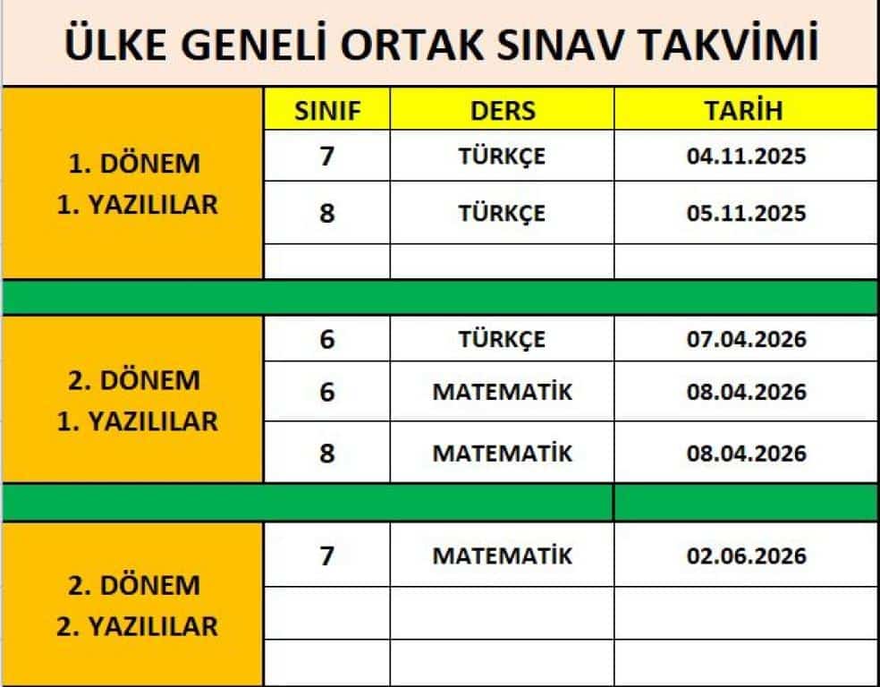 Ülke Geneli Yazılı Tarihleri belli oldu. Ortak yazılılarda konu ve kazanım dağılımı https://odsgm.meb.gov.tr/www/1-donem-konu-soru-dagilim-tablolari-2025-2026/icerik/1474 adresinde yayınlanmıştır.